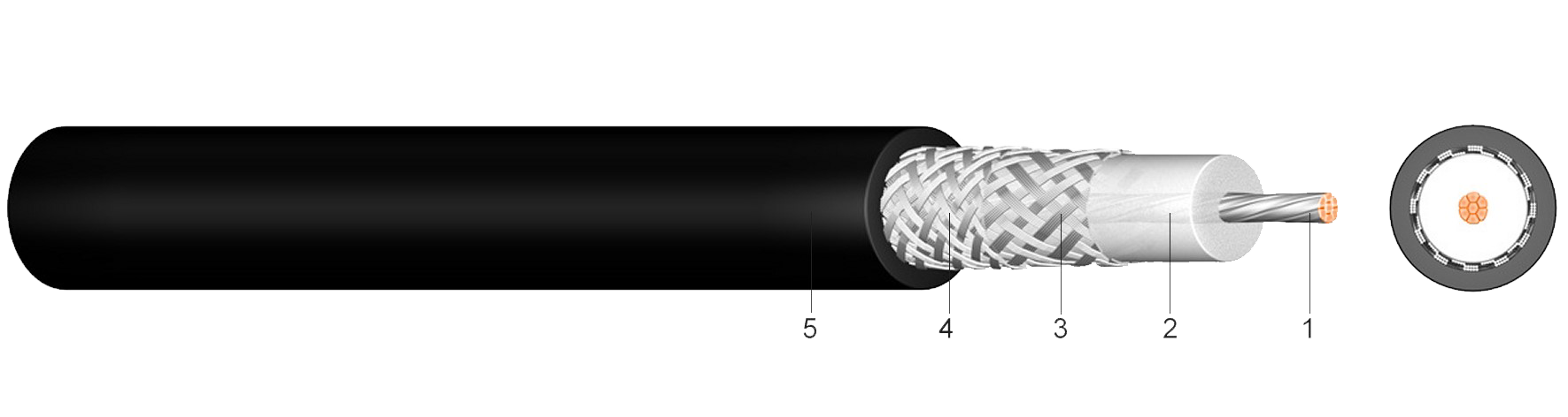 1 ..... ezüstözött, sodrott rézvezető felépítés: 7 x 0,75mm2 ..... polietilén érszigetelés (dielektrikum) Ø kb. 7,25mm